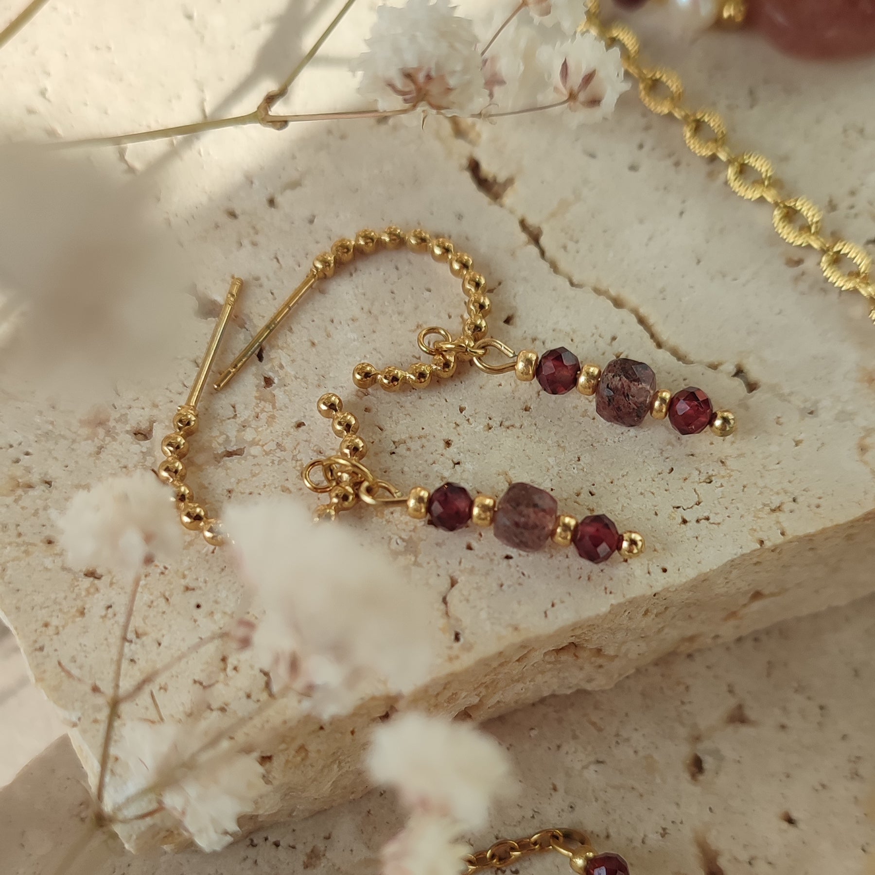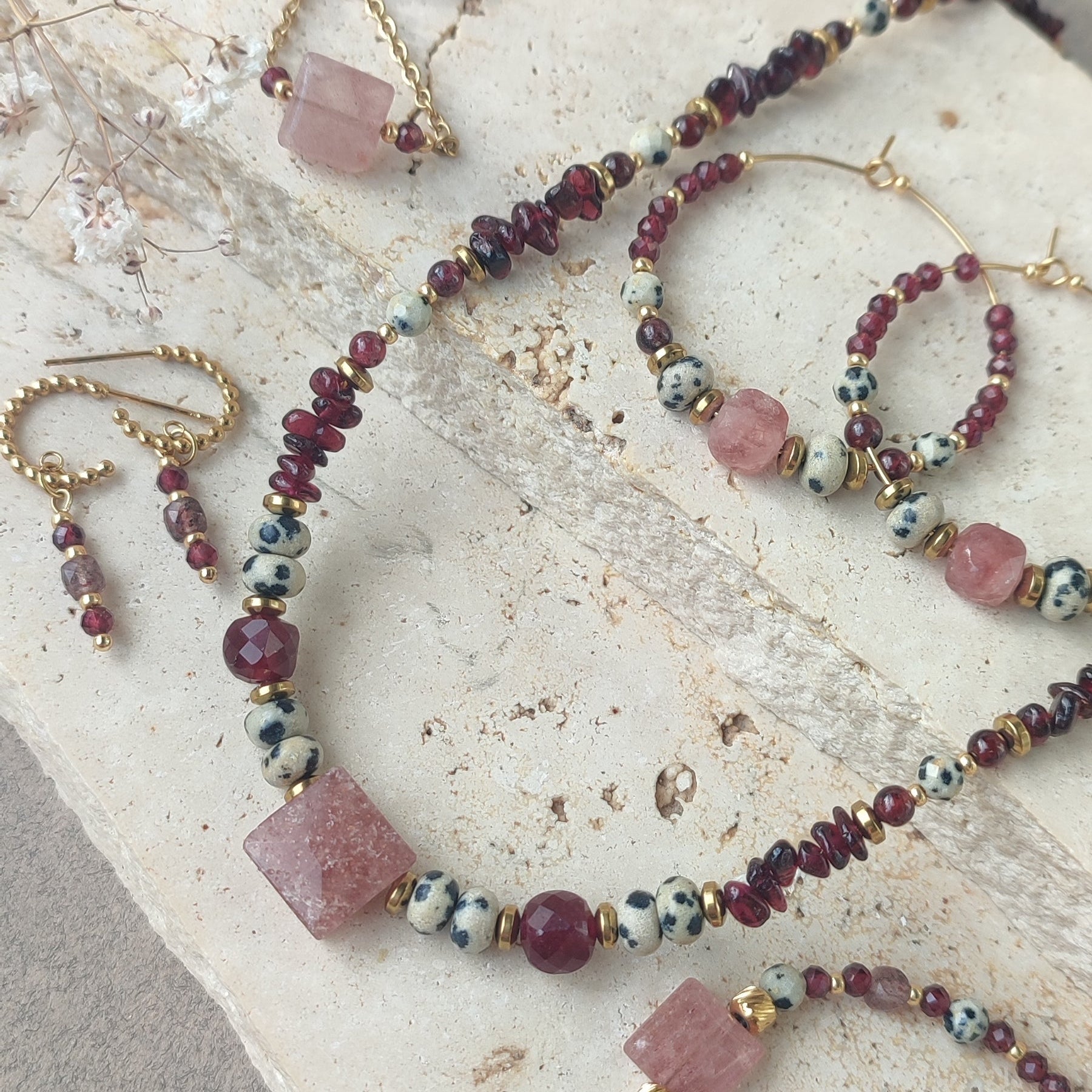 Le grenat rouge apporte confiance et vitalité et le quartz fraise diffuse une énergie tendre .