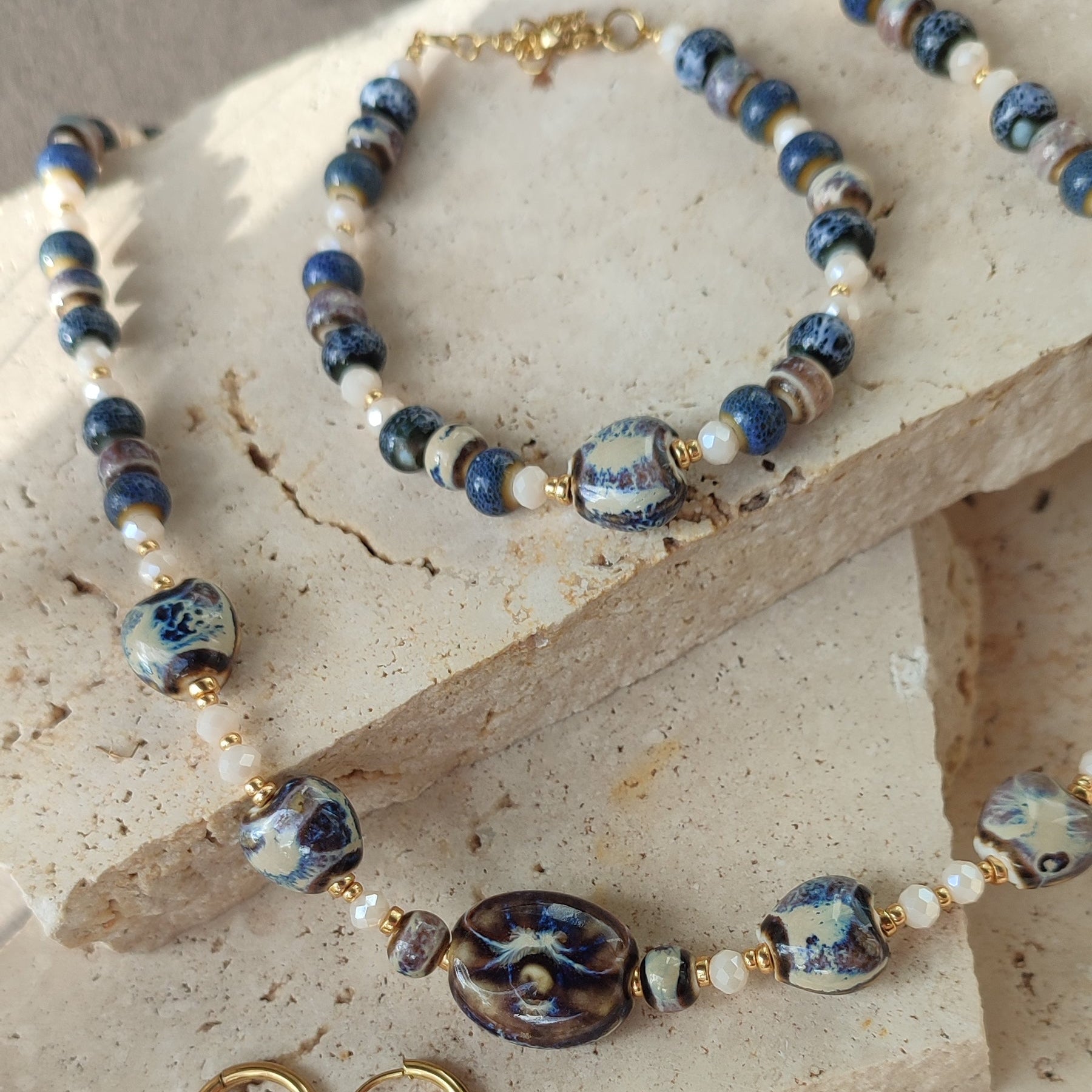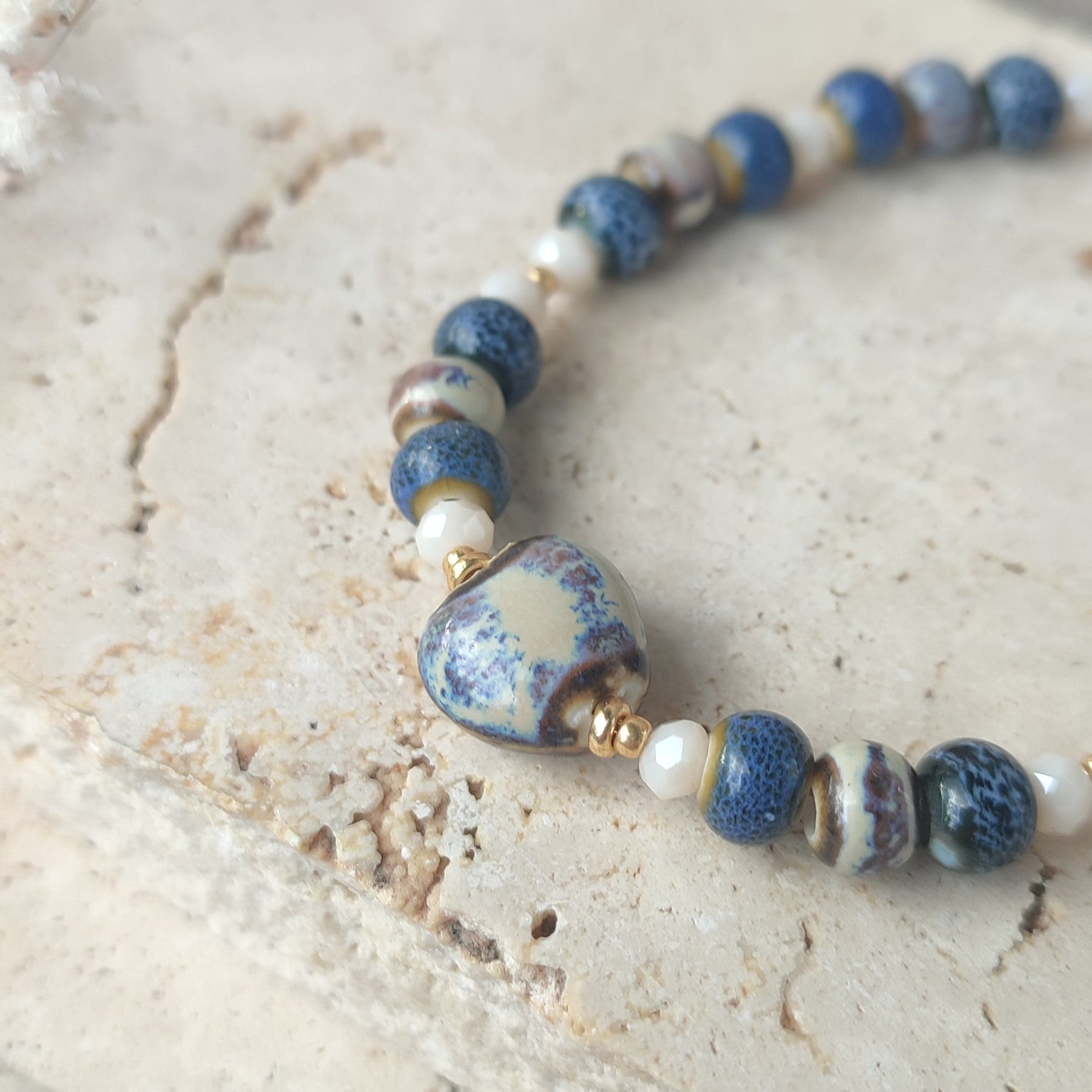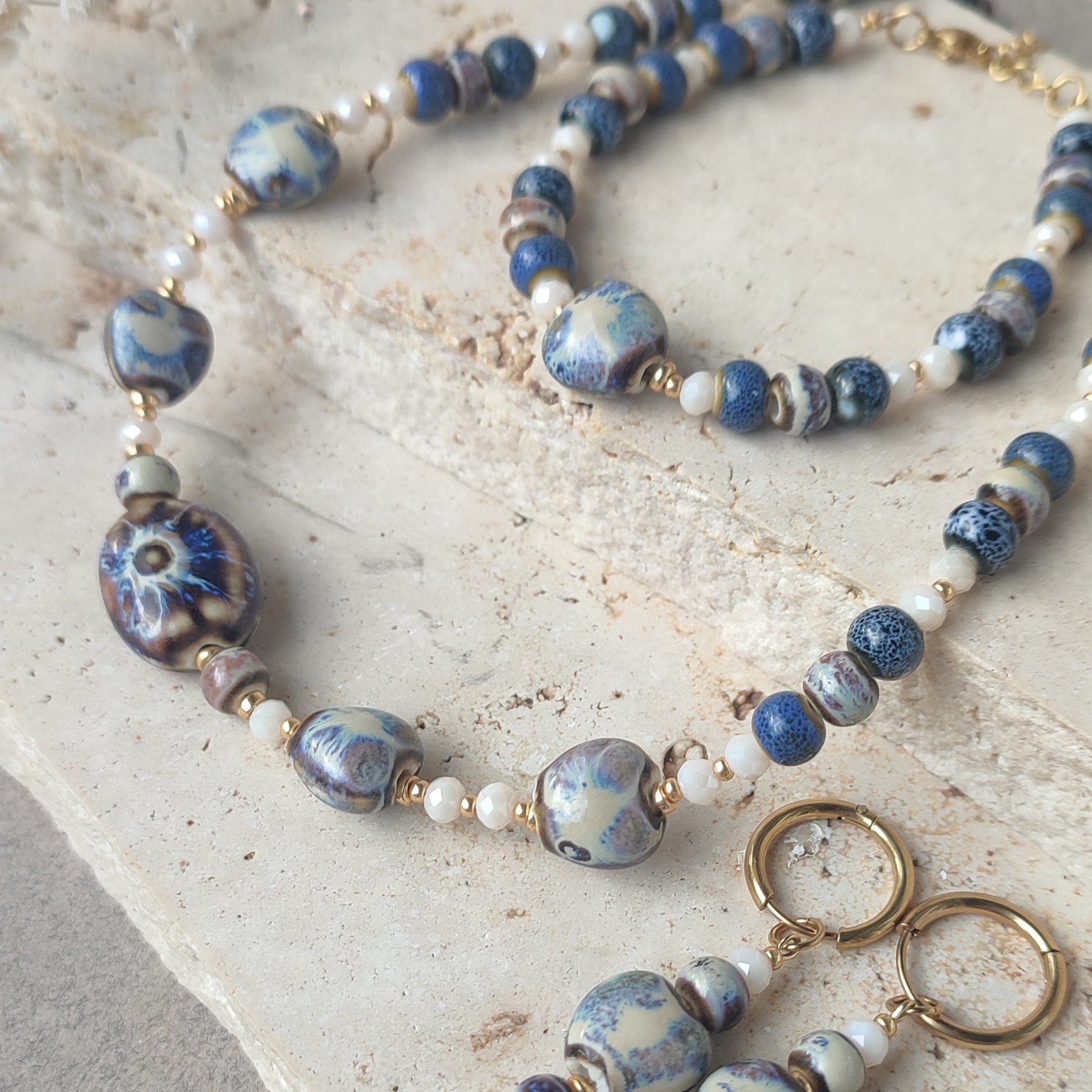 Perles en verre faceté et perles en céramique dans les teintes bleues , crème , marron.
