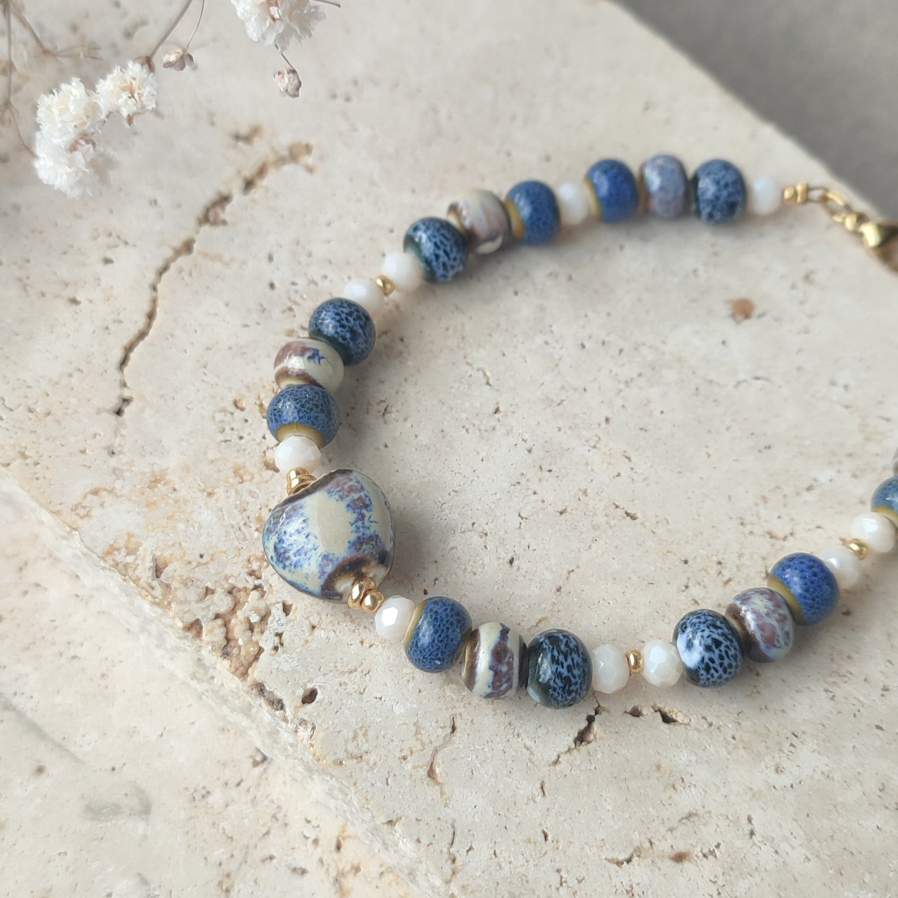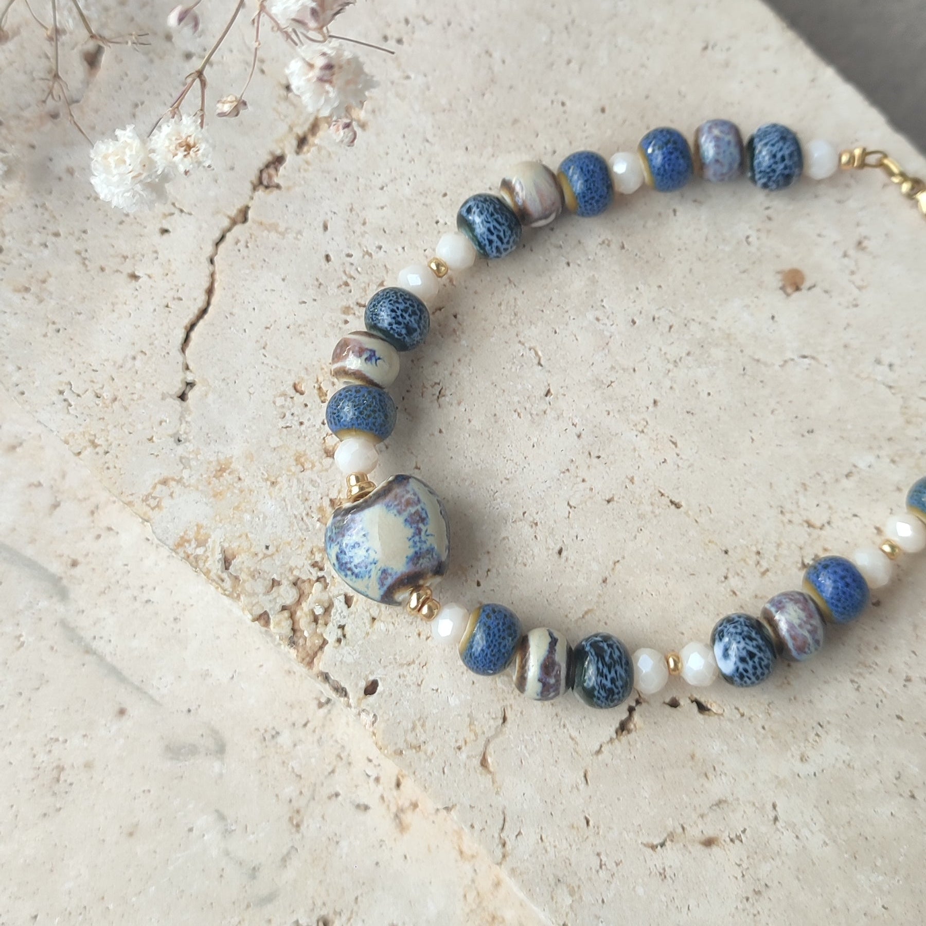 Impossible d'avoir deux fois le même bijoux puisque chaque perle en céramique est différente
