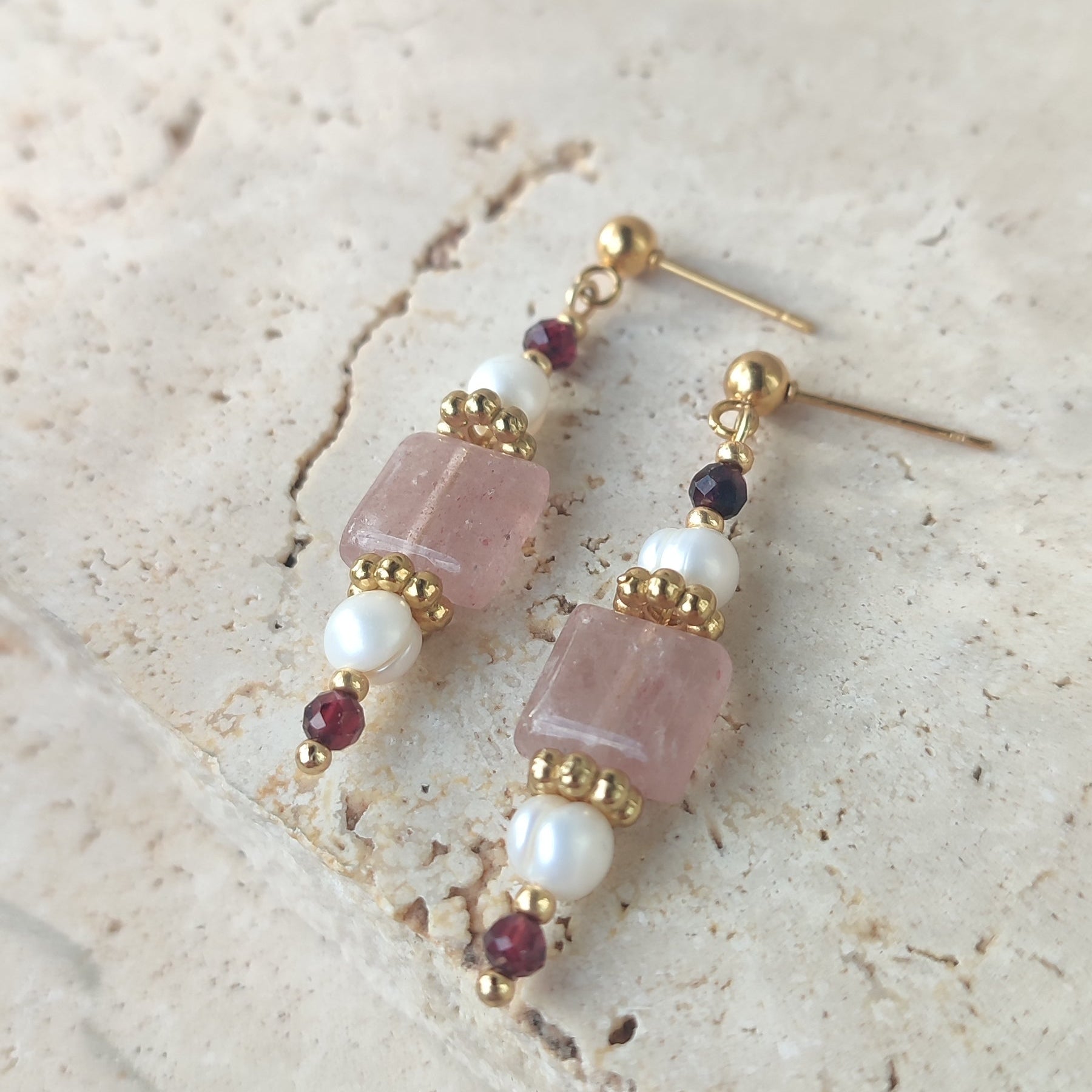 Pierres naturelles : grenat, quartz fraise, perle d’eau douce