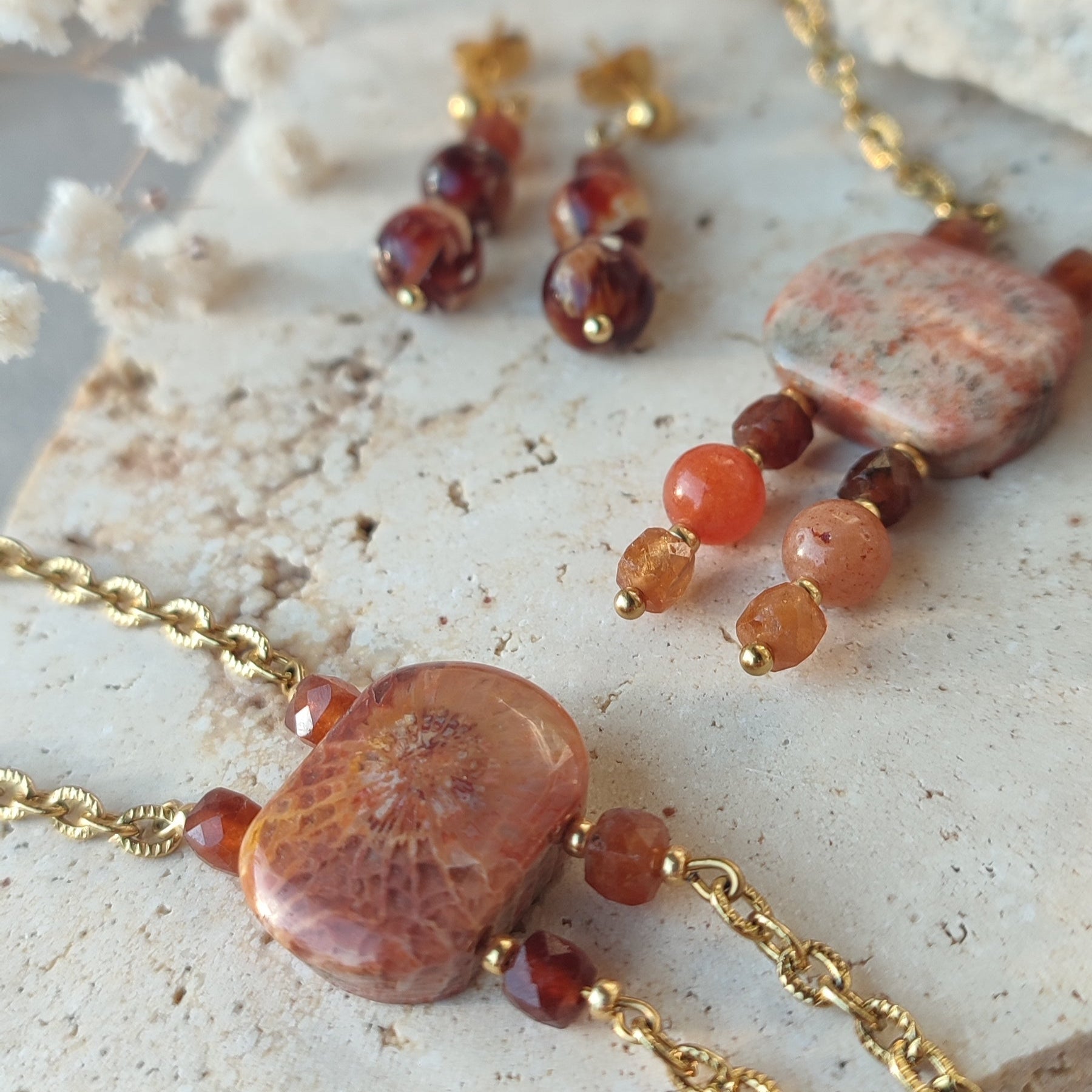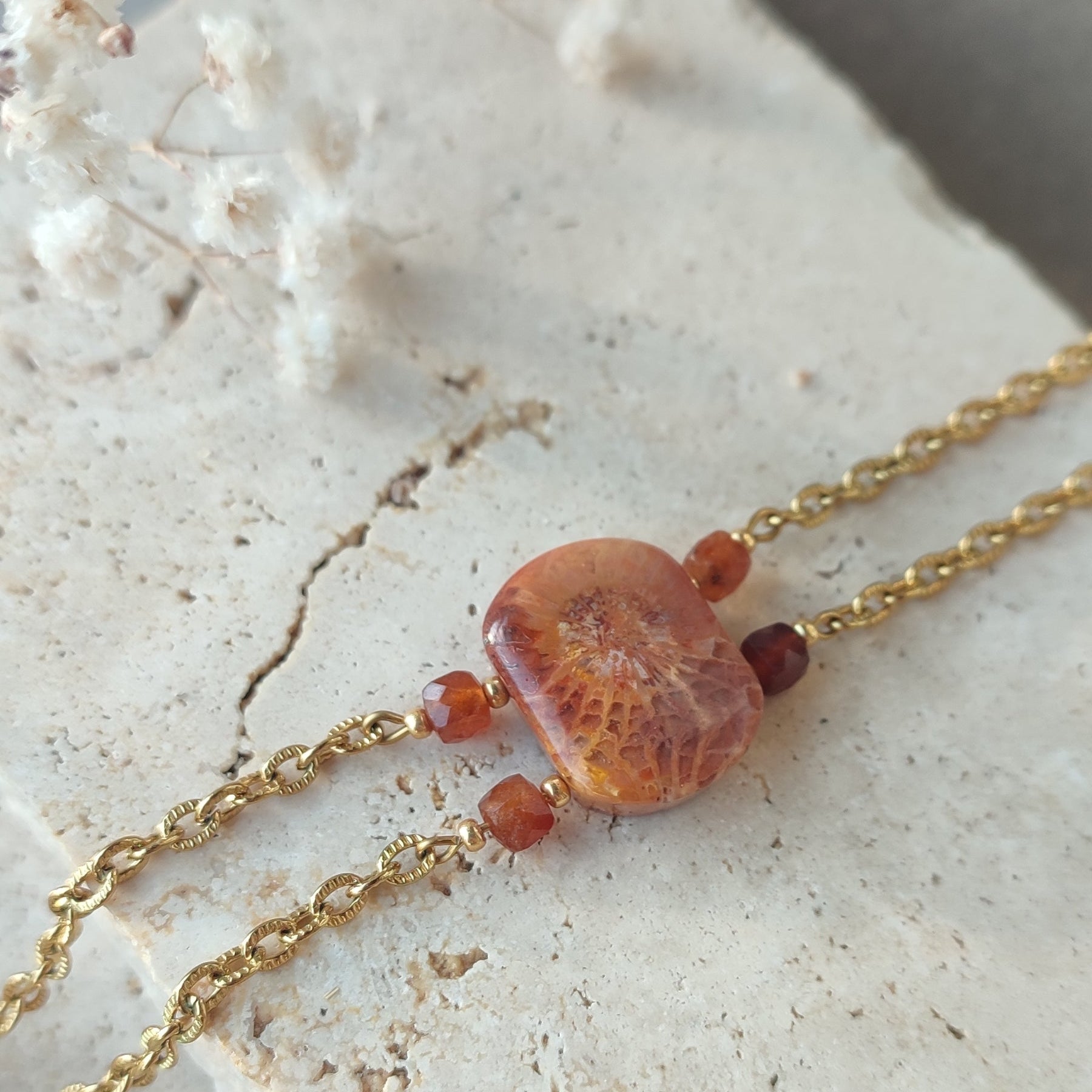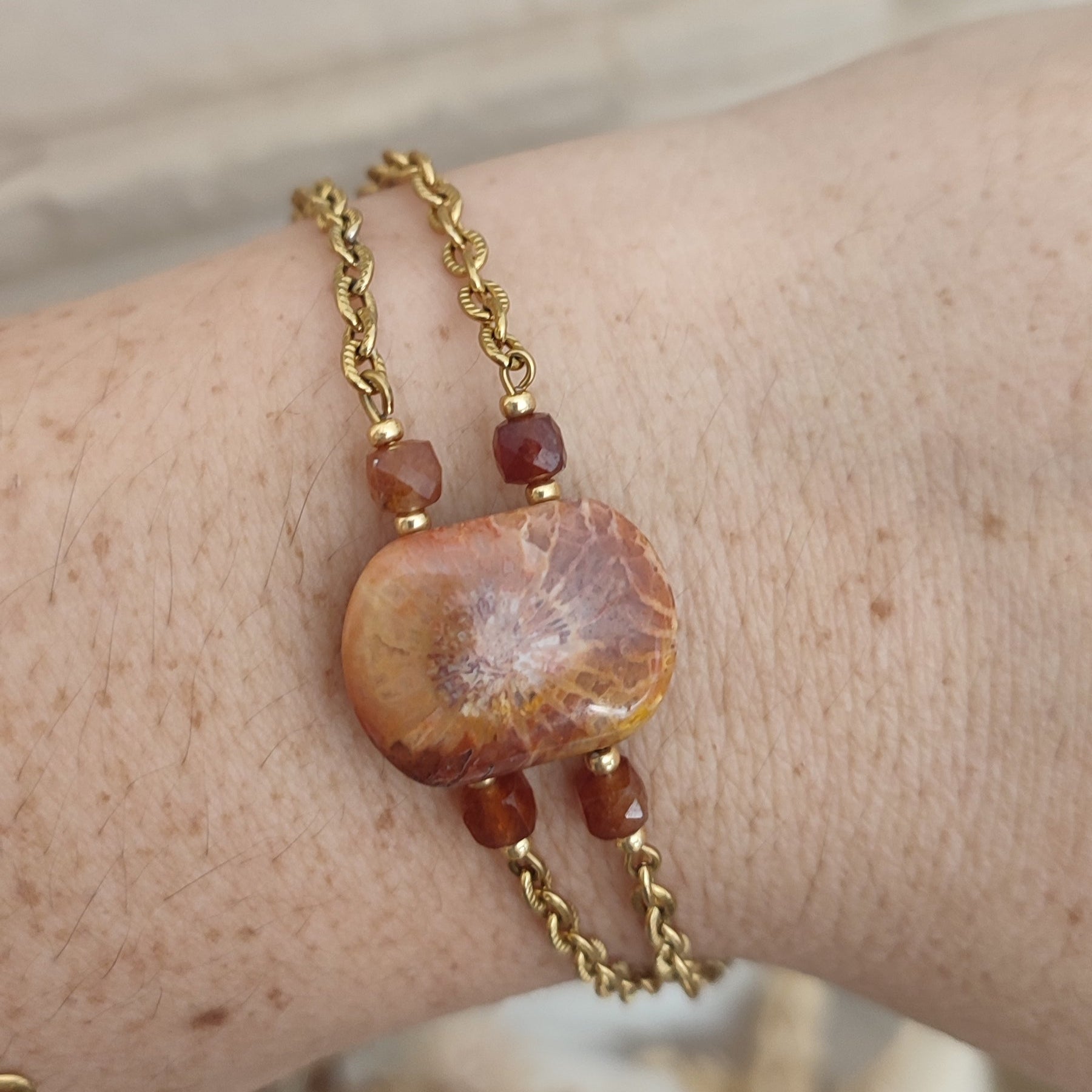 La pierre centrale est une pierre naturelle de corail fossile , il est impossible d'avoir deux fois le même bracelet pusique deux pierres identiques n'existent pas . Cet pierre est juste une merveille de la nature...