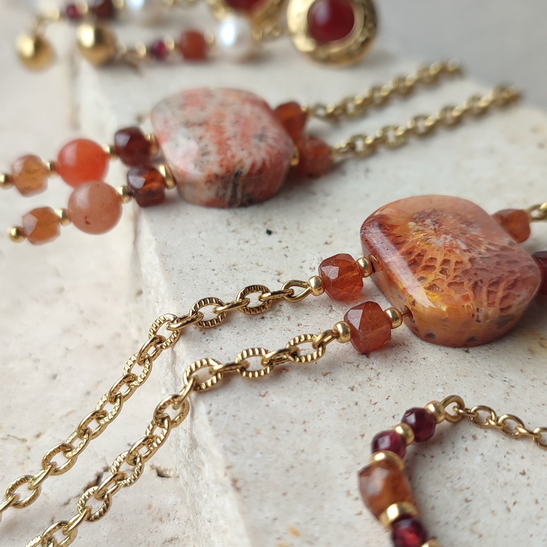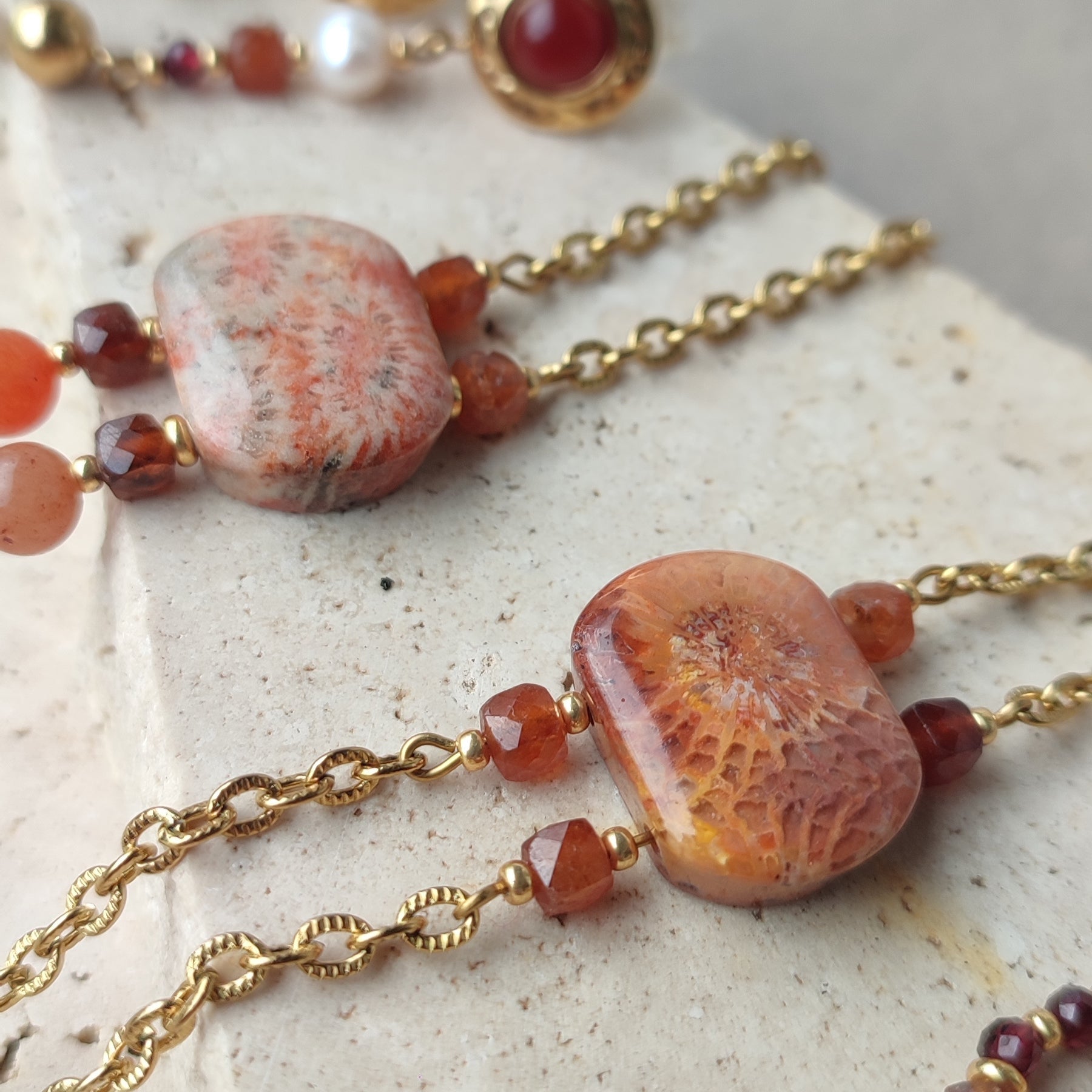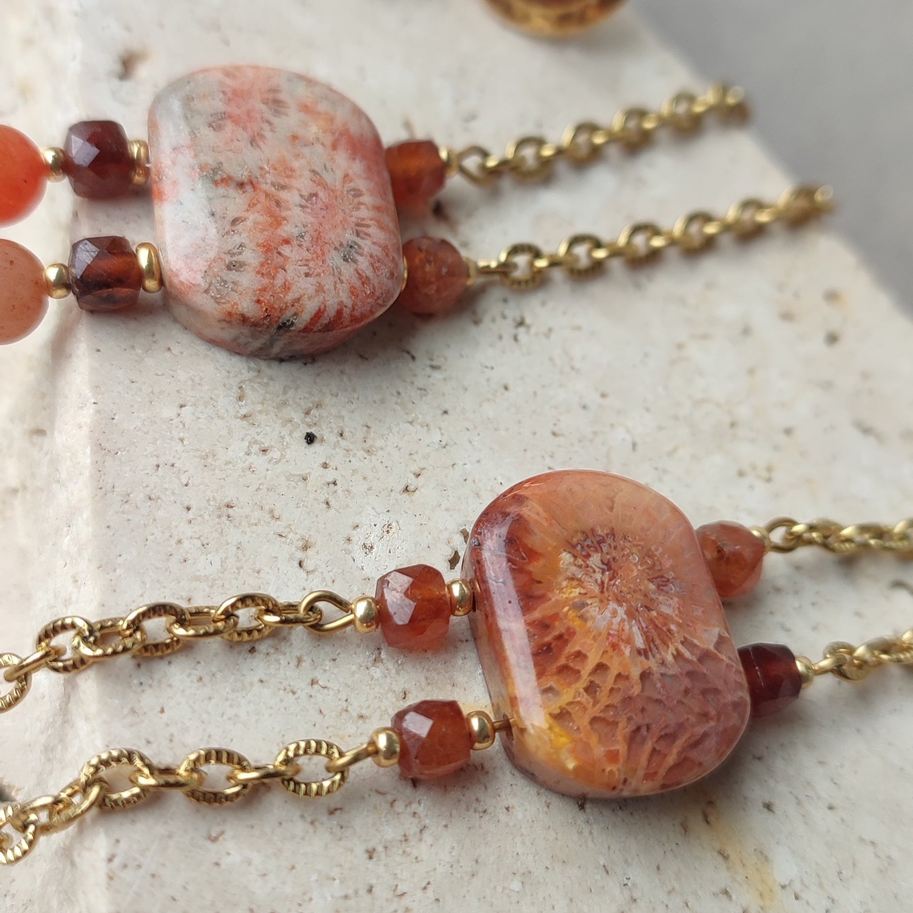 La pierre centrale est une pierre naturelle de corail fossile , il est impossible d'avoir deux fois le même bracelet pusique deux pierres identiques n'existent pas . Cet pierre est juste une merveille de la nature...