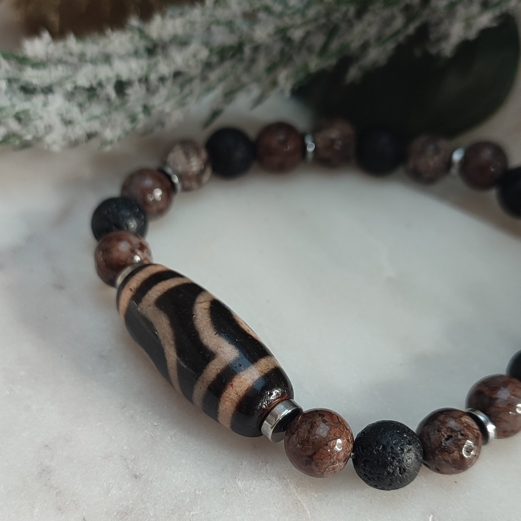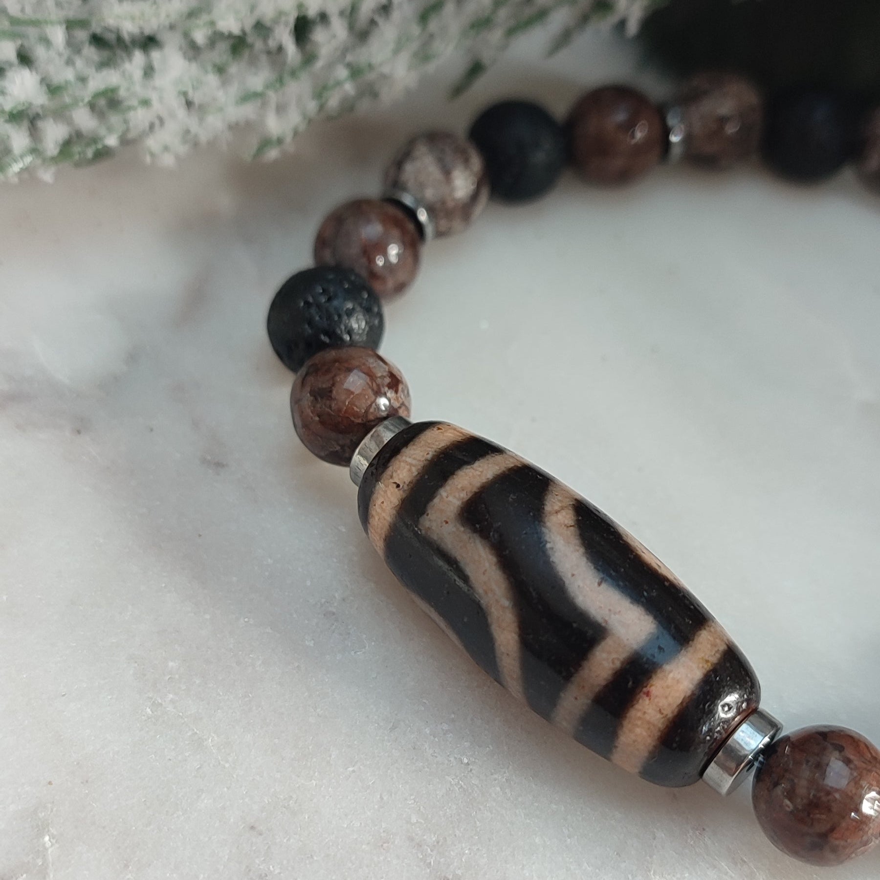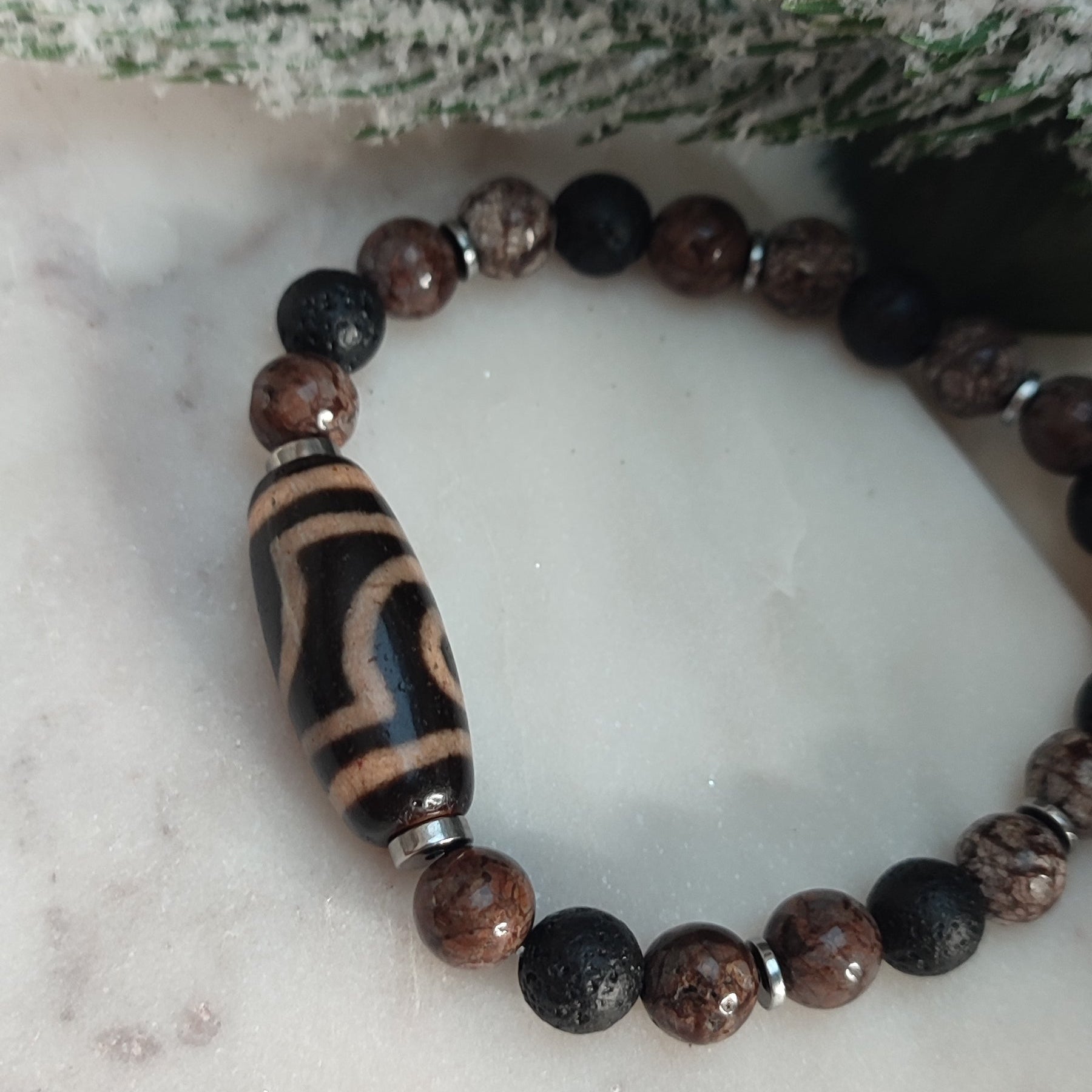Perles obsidienne , lave et hématite , piece centrale en agate dzi