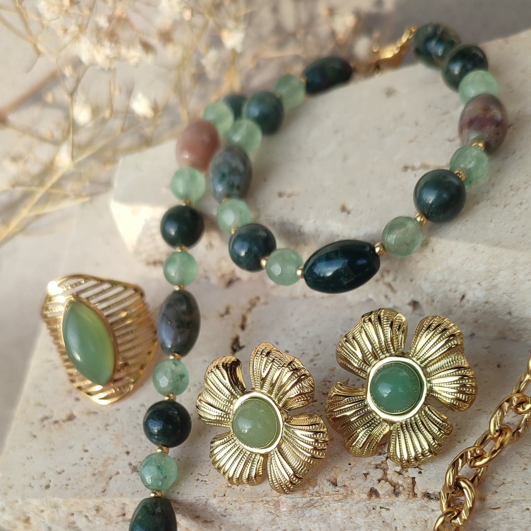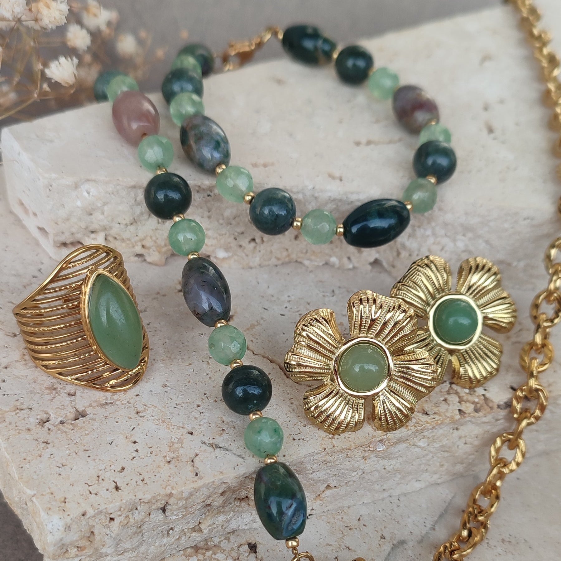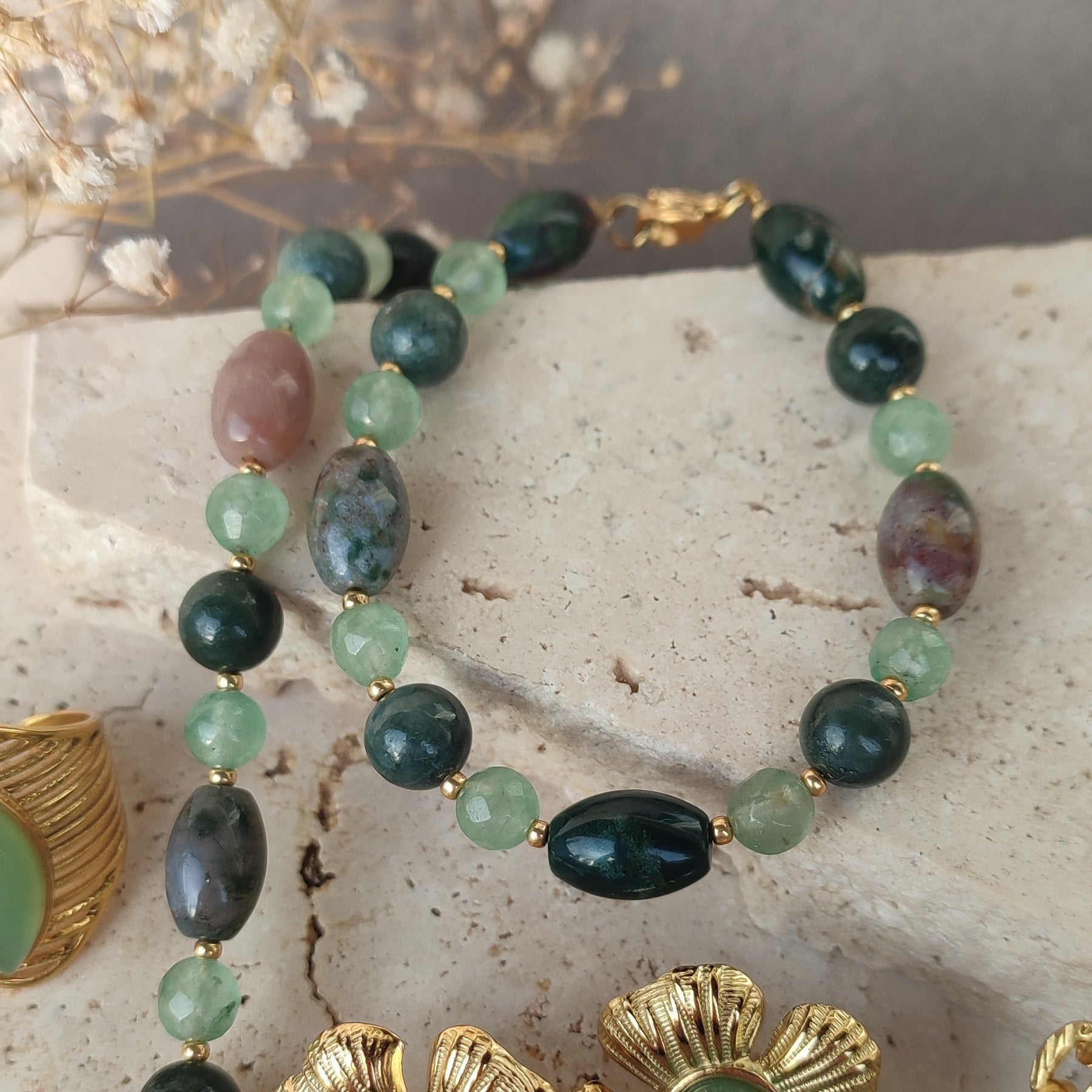Perles ovales en pierre naturelle d'agate indienne , pierres de jade et d'aventurine verte facettées