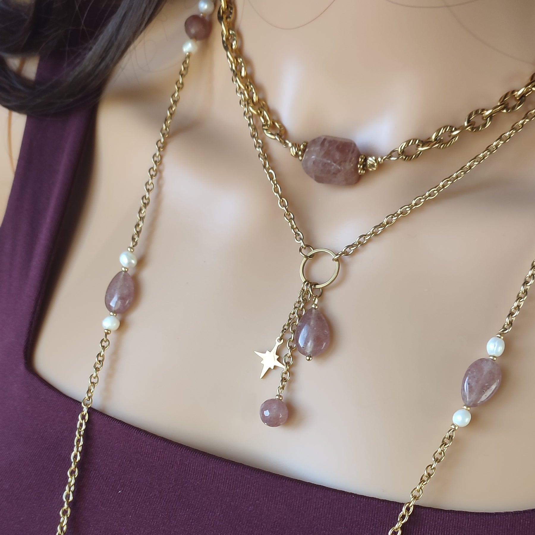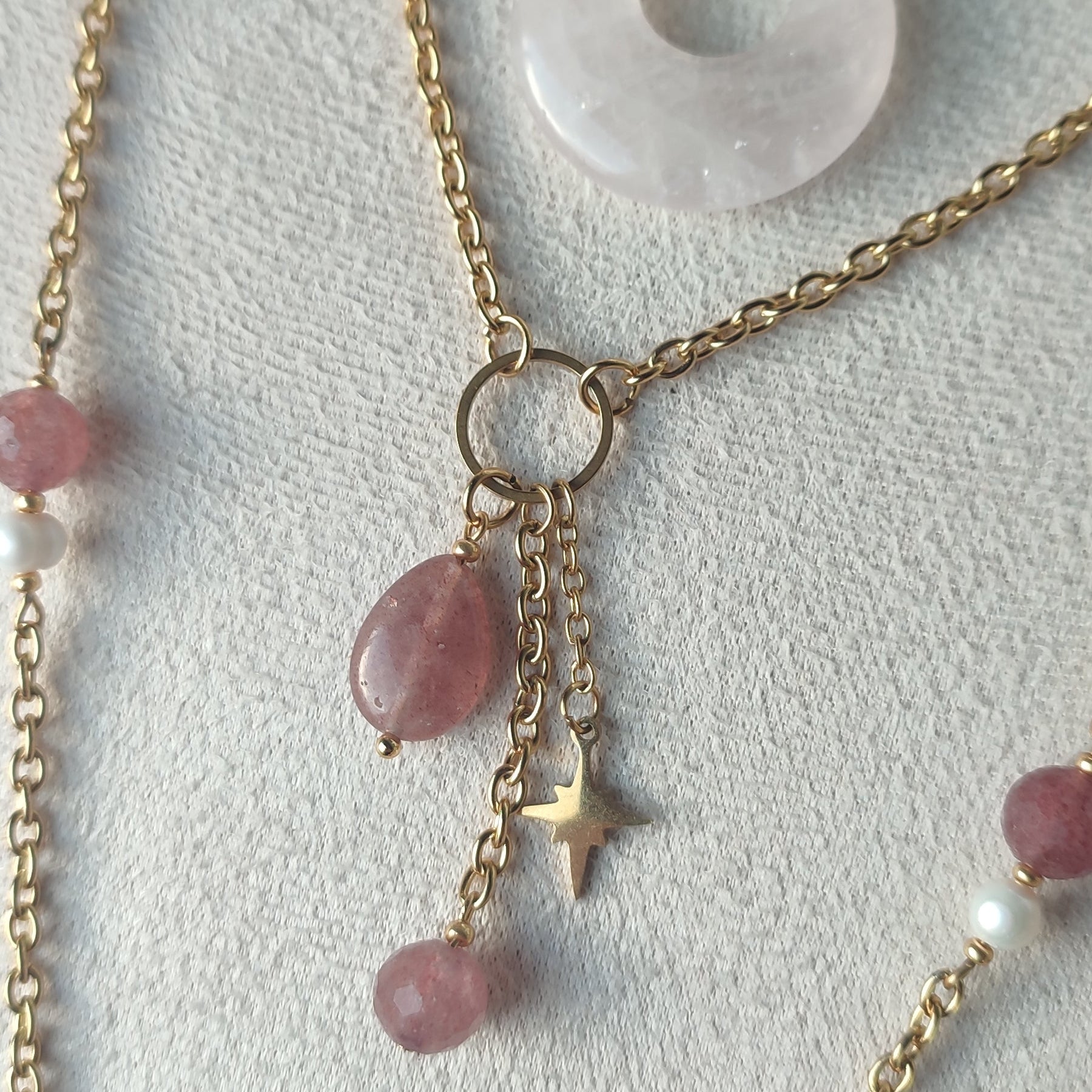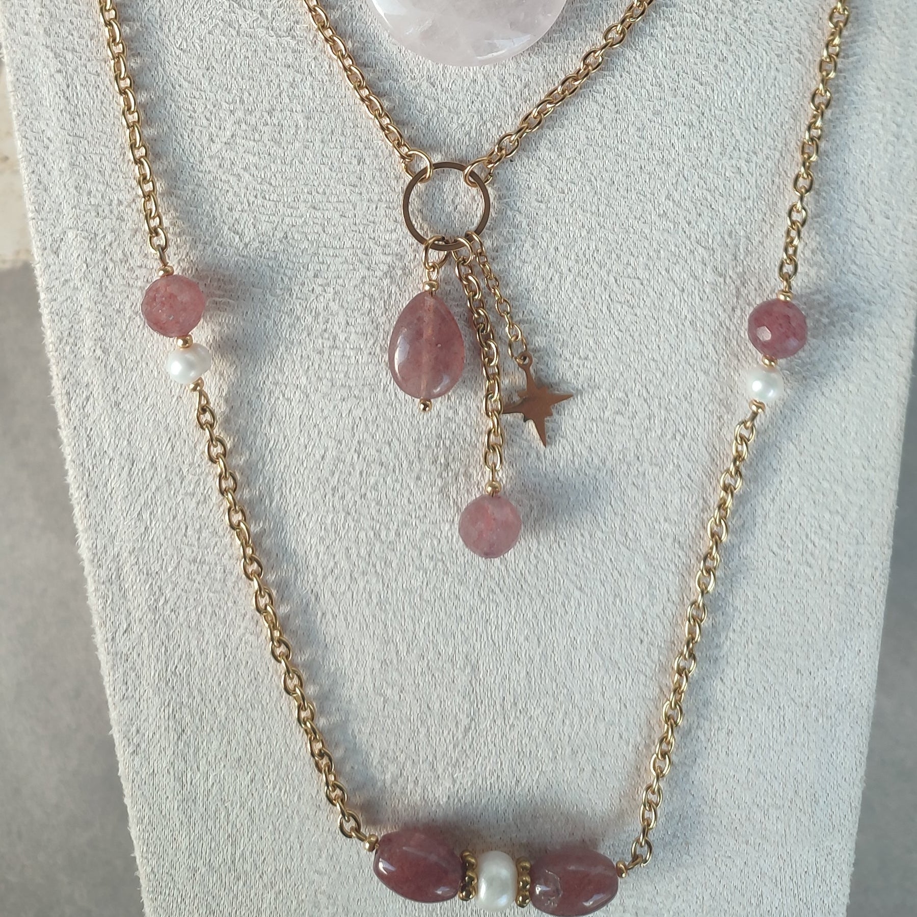 Laissez-vous envoûter par le collier Louna, une création poétique qui invite à la rêverie. Ce bijou unique met en scène une accumulation harmonieuse de pendentifs, chacun apportant sa propre lumière. Au centre du collier sur un cercle en acier sont suspendus , une goutte généreuse de Quartz Fraise dévoile ses nuances rosées et ses inclusions naturelles fascinantes, tandis qu'une petite perle ronde de la même pierre, finement facettée, capte et multiplie les reflets du soleil à chaque mouvement.