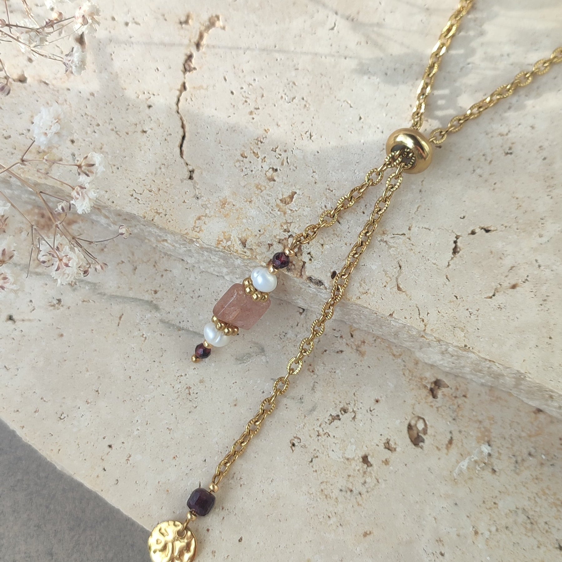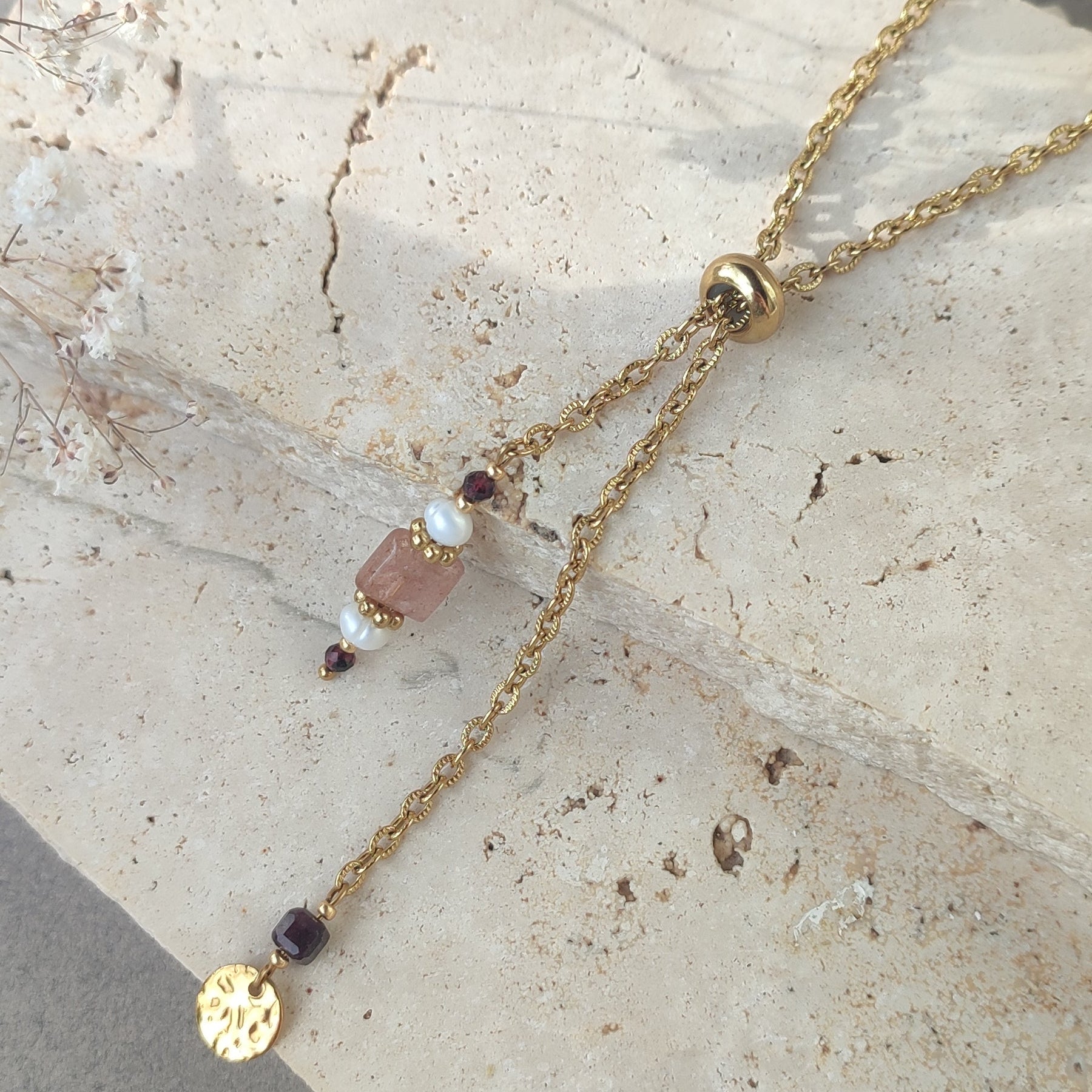 Le grenat rouge apporte confiance et vitalité, le quartz fraise diffuse une énergie tendre, tandis que la perle d’eau douce illumine l’ensemble d’un éclat naturel et intemporel.