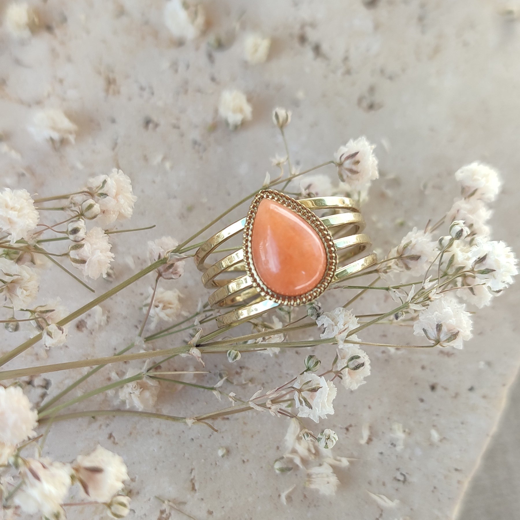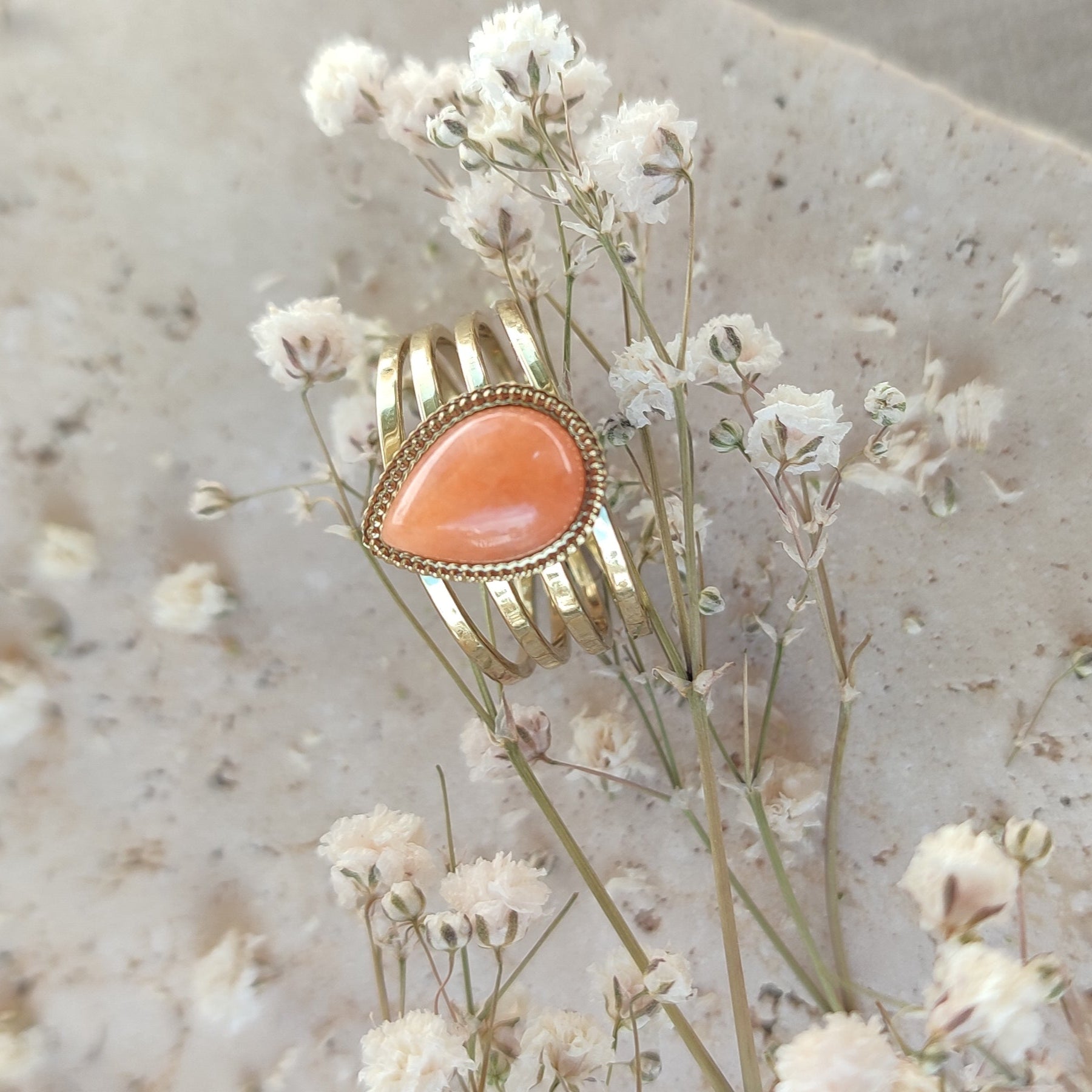 Offrez-vous ou offrez cette bague en acier doré avec pierre orange, et laissez-la apporter une touche de lumière à vos moments !