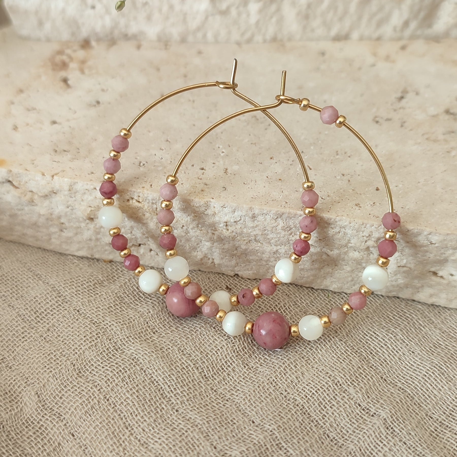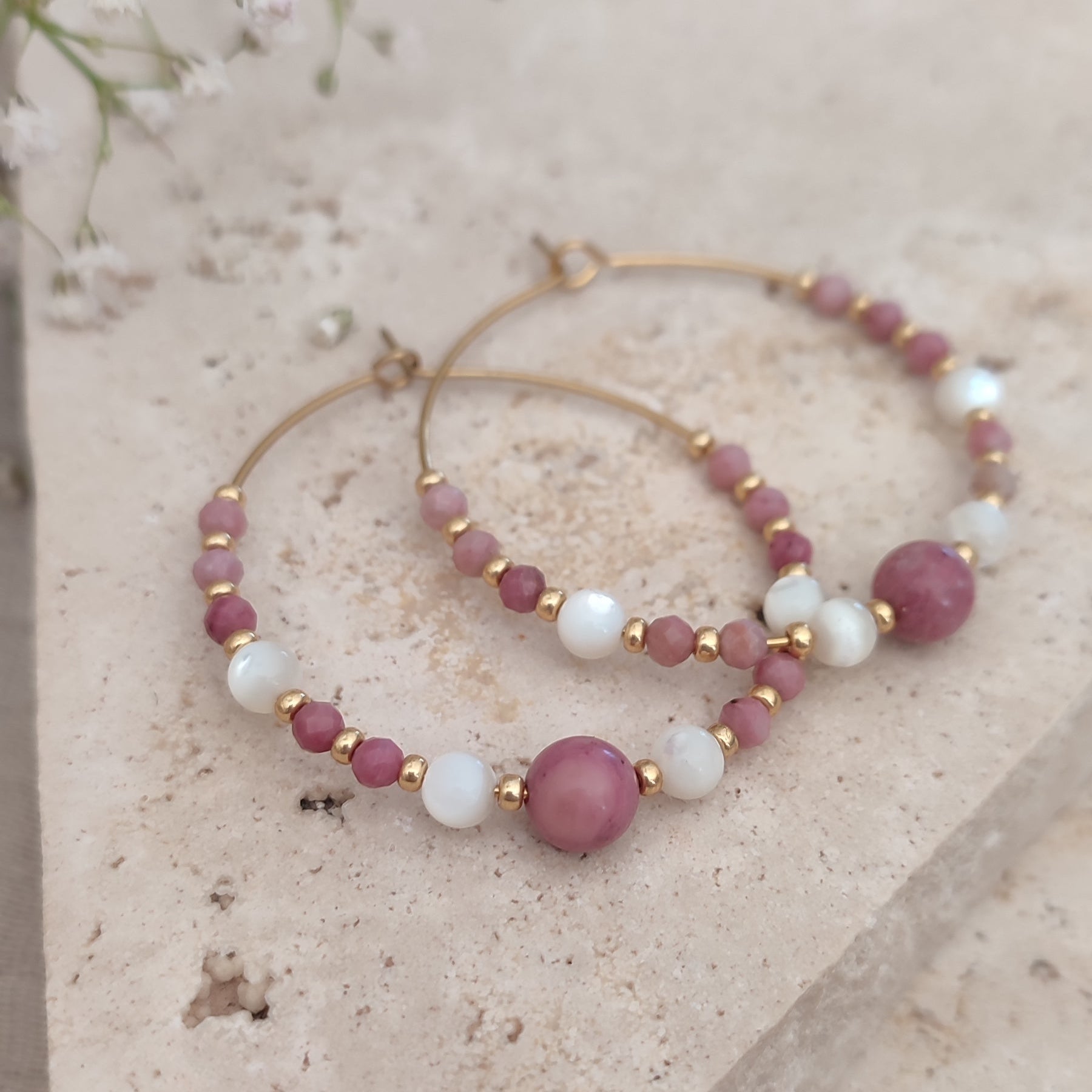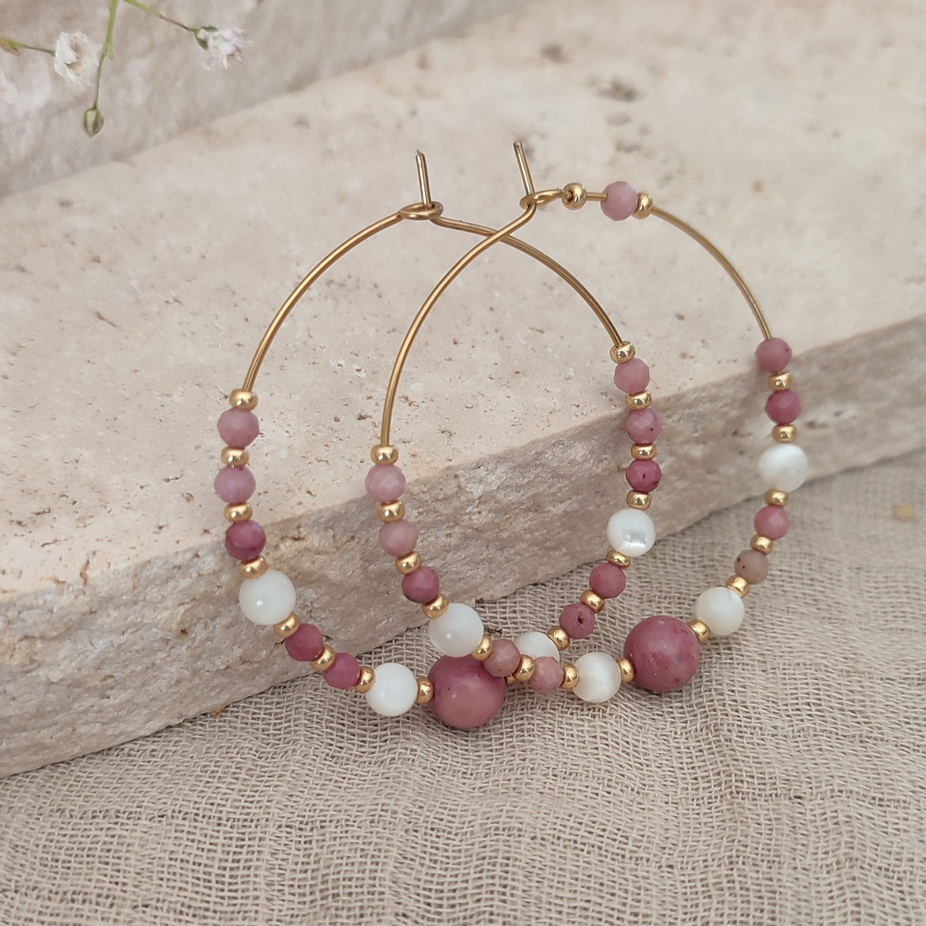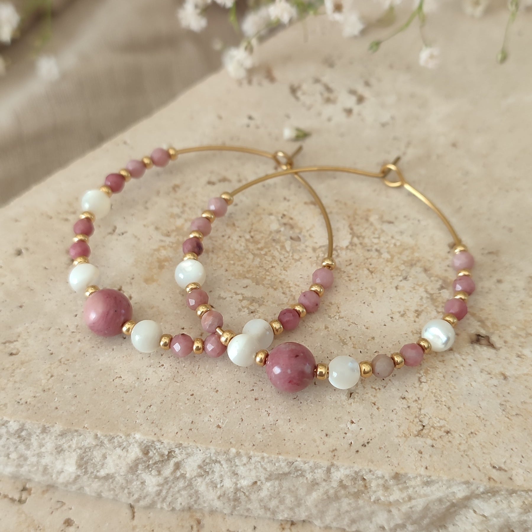 Assemblées à la main avec des perles de nacre et des pierres de rhodocrosite facetées