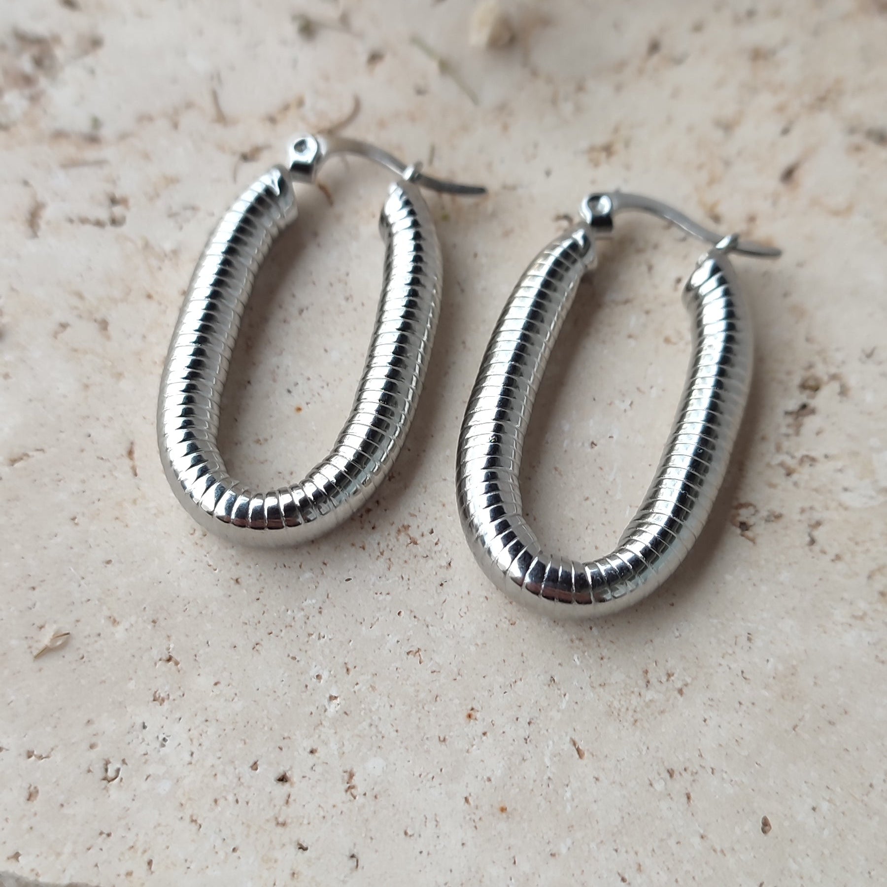 Les boucles d'oreilles Stacy en acier chirurgical striées sont à la fois élégantes et durables.