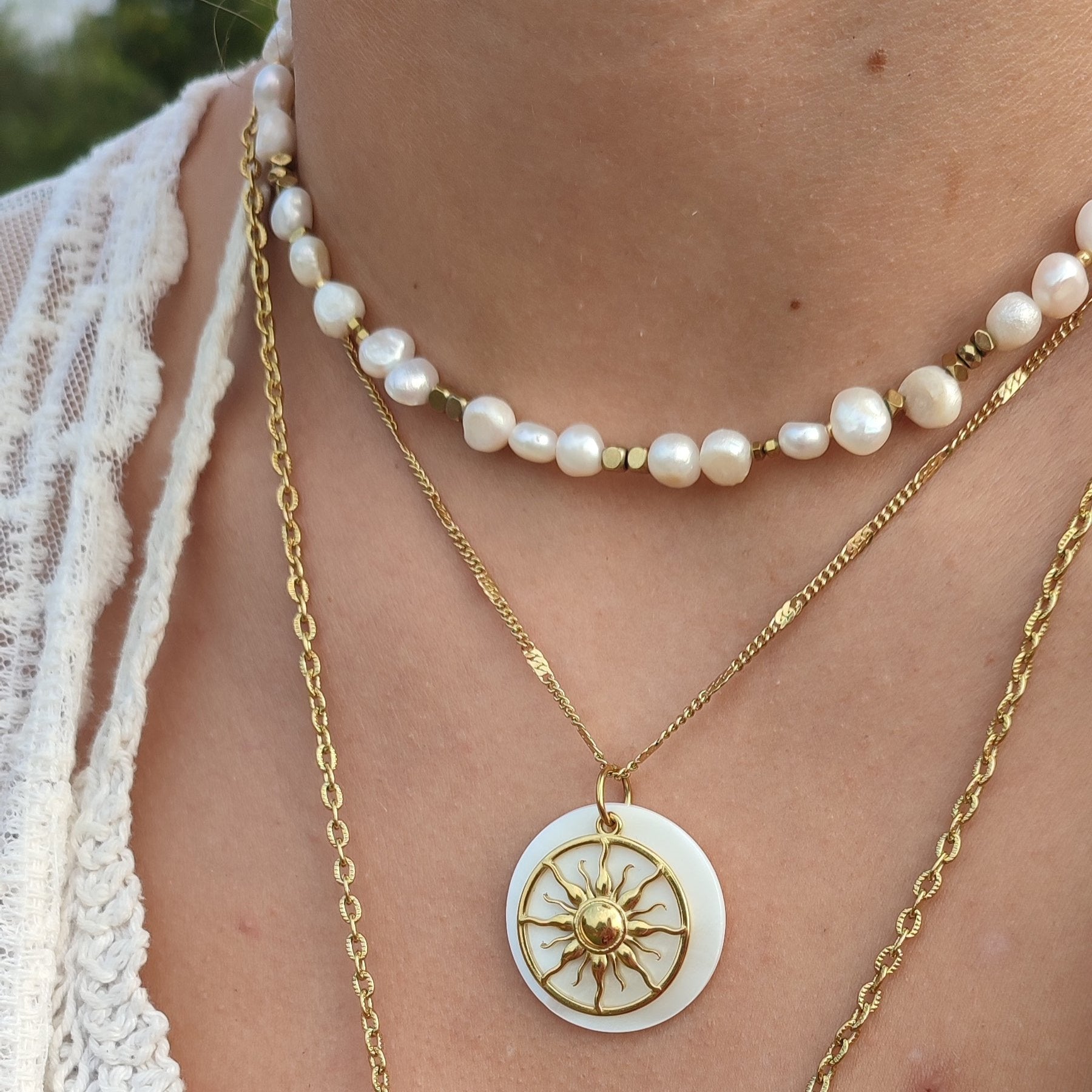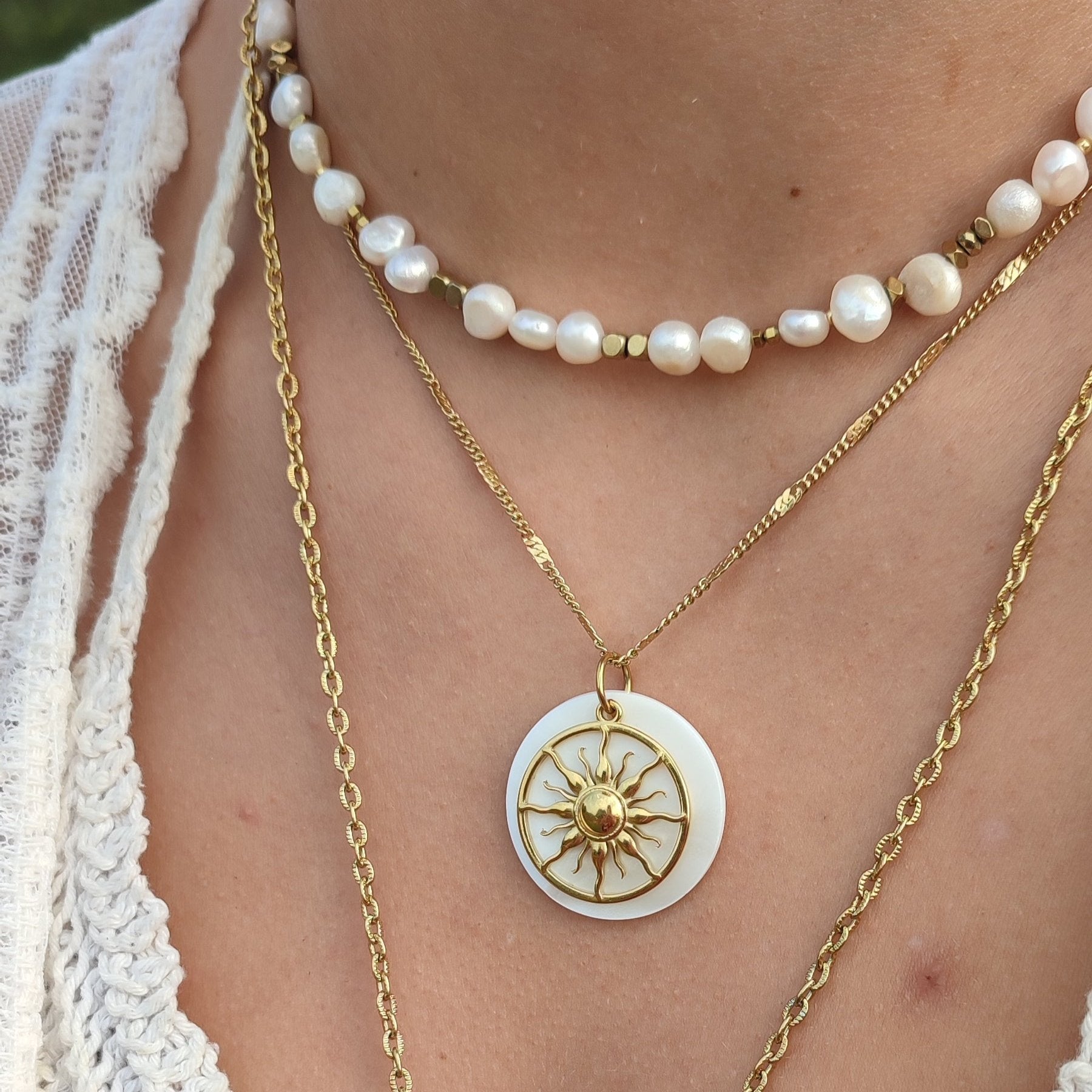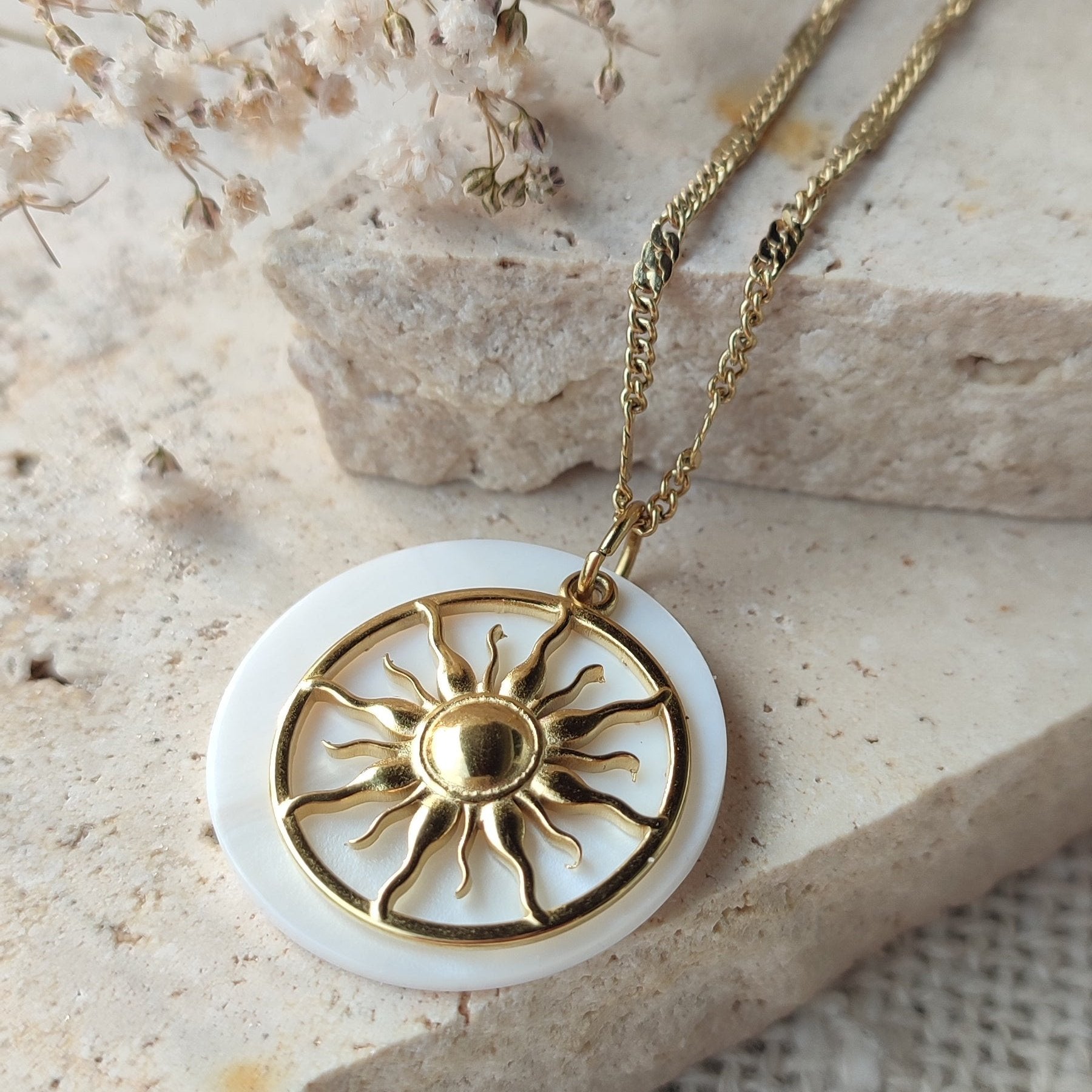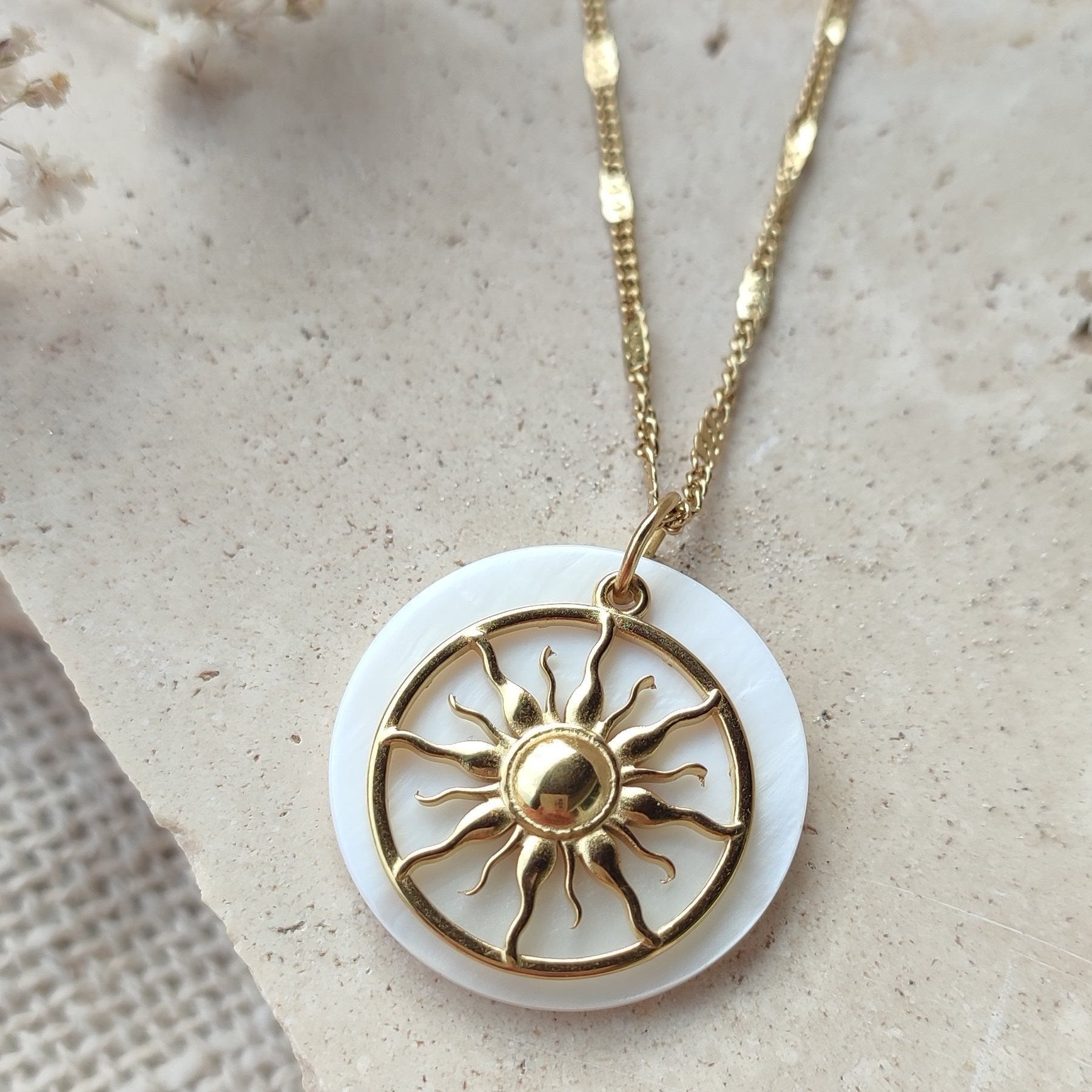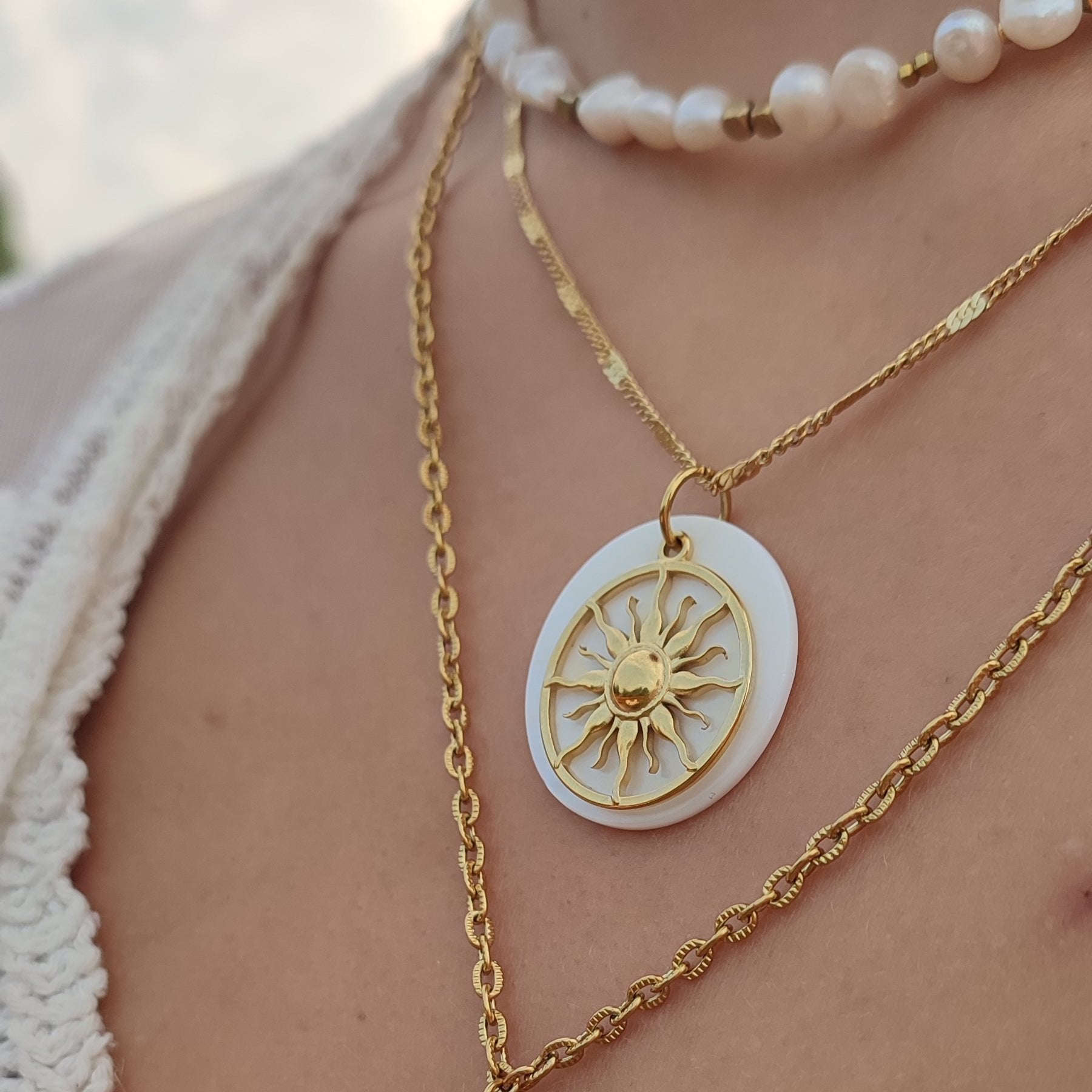 Le collier Sun est un bijou unique, assemblé à la main avec un pendentif en nacre et un soleil.